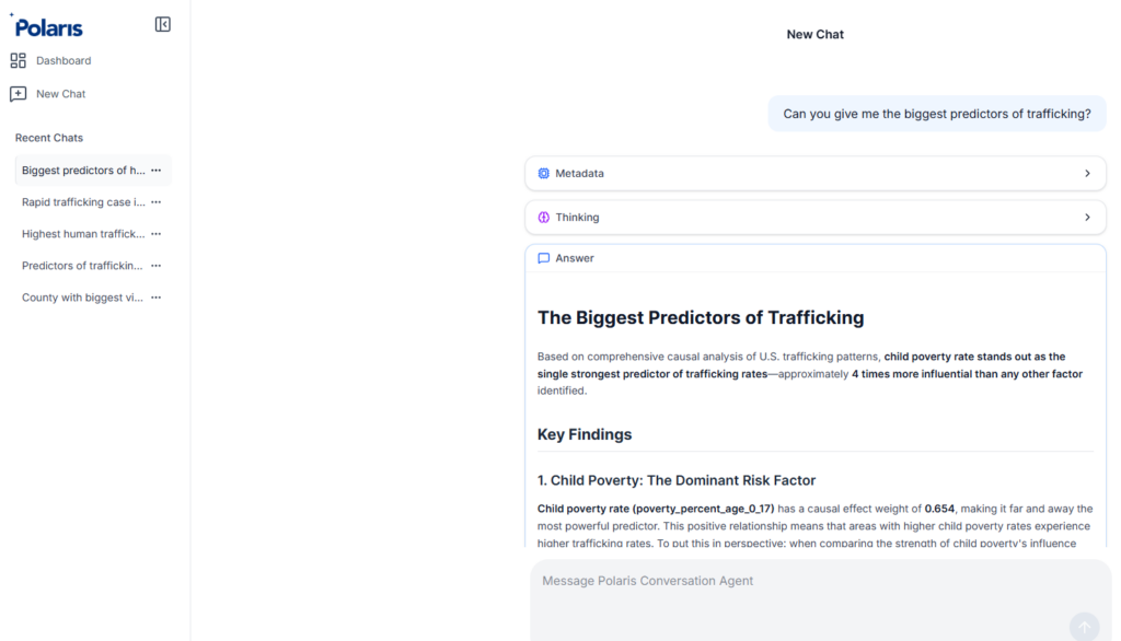 Built collaboratively by Polaris, CML Insight, and Limbik, the prototype reflects the integration of deep social-sector expertise, advanced modeling capabilities, and a shared commitment to ethical and responsible innovation. Polaris brought more than two decades of experience operating the National Human Trafficking Hotline and supporting survivors. Technology firms CML Insight and Limbik contributed their expertise in causal and agentic AI and supported the compilation of trusted open-source data sets. The Patrick J. McGovern Foundation, with a commitment to responsible AI experimentation in the nonprofit sector, provided the seed funding.